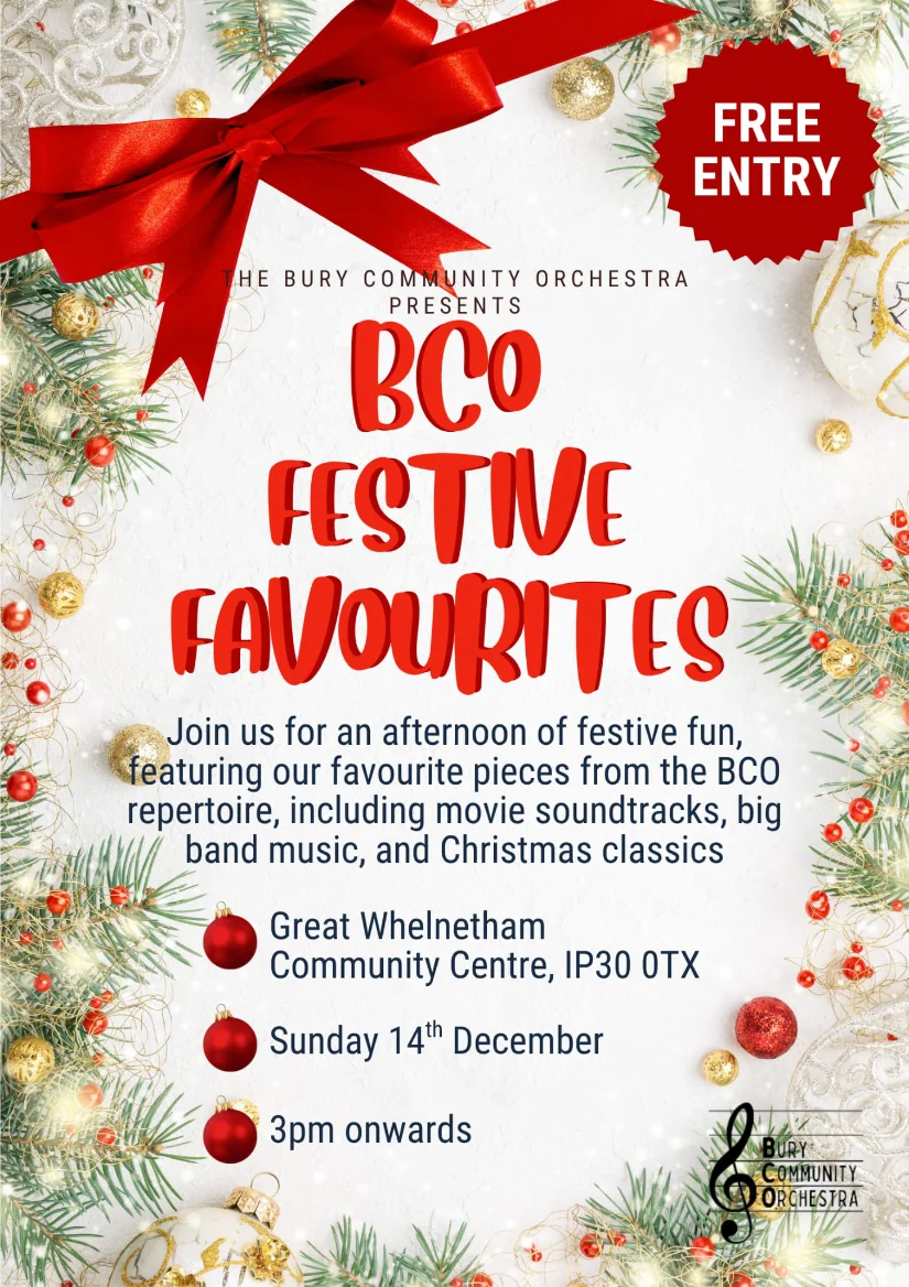 Bury Community Orchestra meet weekly on a Tuesday from 18:00 to 20:00 at Christ Church, Moreton Hall in Bury St Edmunds. We are a friendly group of amateur musicians across all grades, no one is excluded.